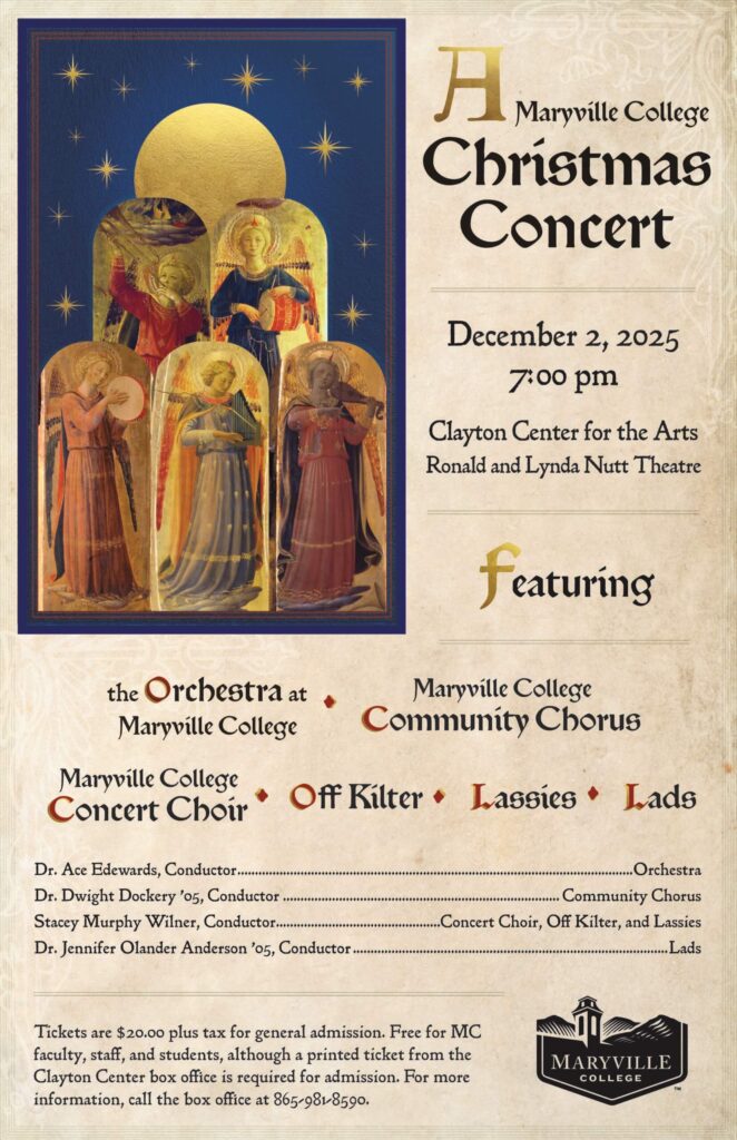The annual “A Maryville Christmas” concert begins at 7 p.m. in the Ronald and Lynda Nutt Theatre at the Clayton Center for the Arts. The evening features the Maryville College Concert Choir performing A Ceremony of Carols by Benjamin Britten, sing-along selections with the Orchestra at Maryville College, the Maryville College Community Chorus, and chamber ensembles Off Kilter, Lads and Lassies sharing beloved holiday classics.