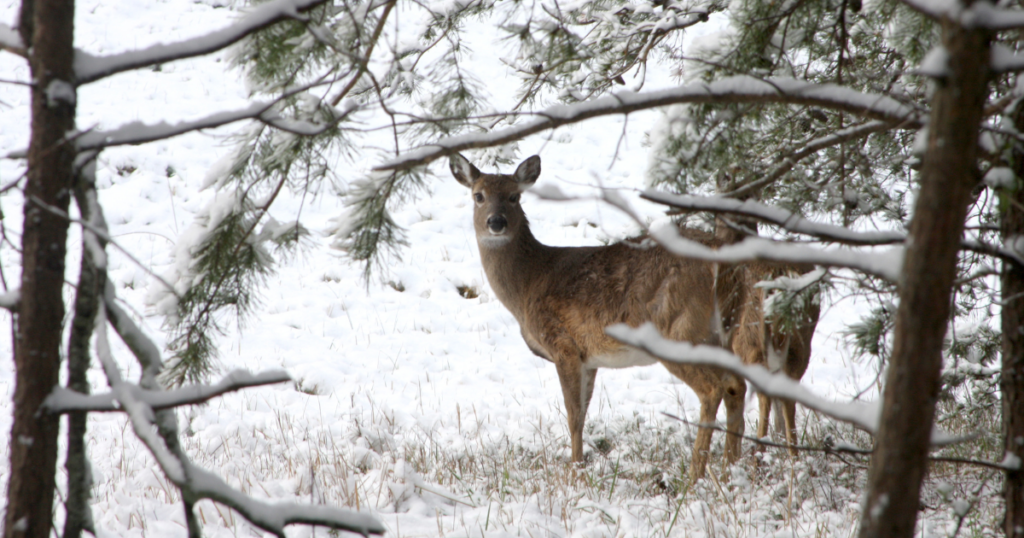 There, it’s quite common to see white-tailed deer prancing across the meadows. They may also venture deeper into the forest, as food is scarcer.
